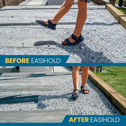 Easihold est spécialement conçu pour fixer solidement les pierres et galets de 4 à 20 mm, qu’ils soient neufs ou déjà en place.