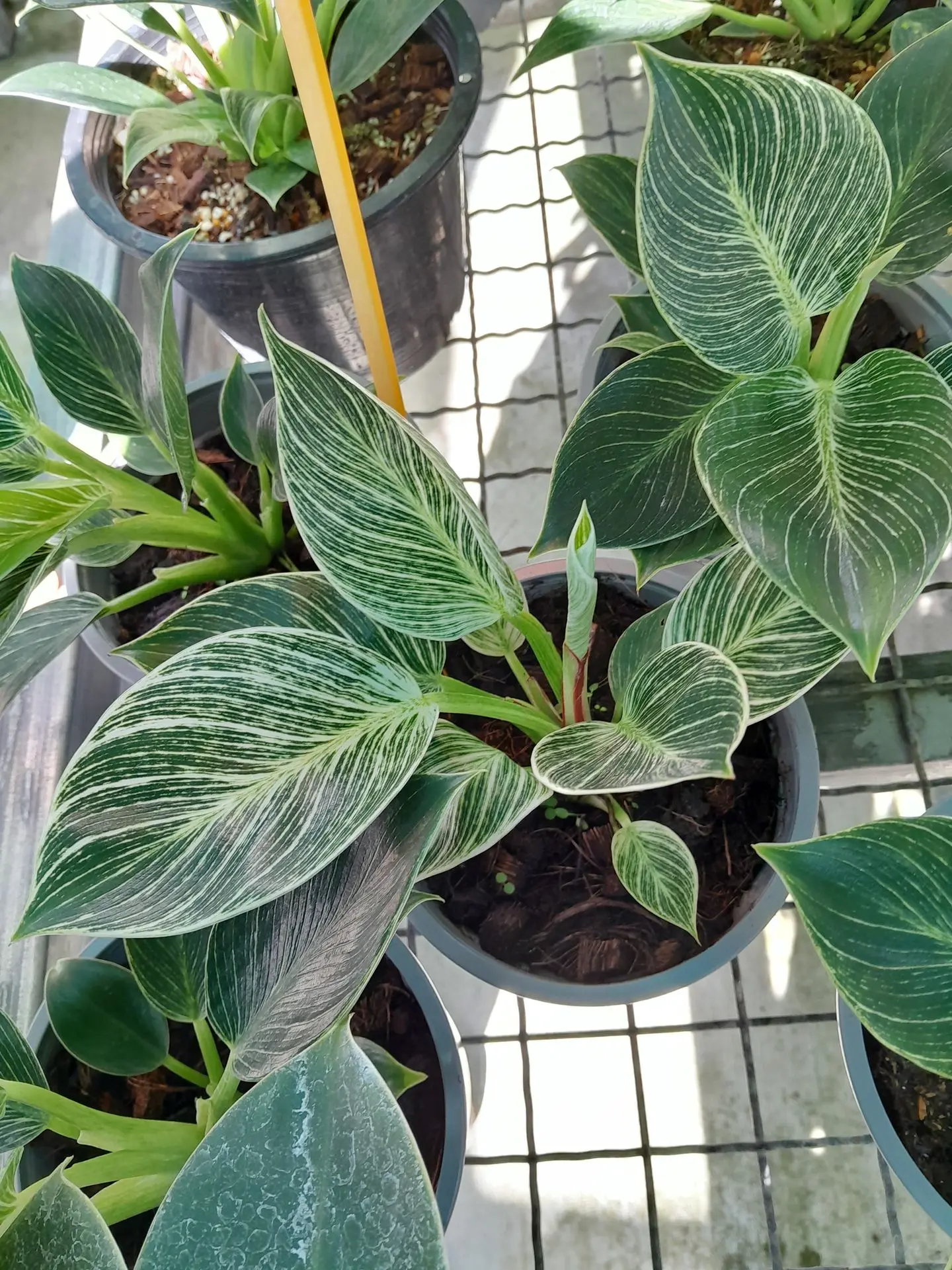 📍 Origine : Mutation spontanée issue du Philodendron Rojo Congo, appartenant à la famille des Aracées 🌿 Taille : Port compact, généralement 35 à 45 cm de hauteur en intérieur 🍃 Feuillage : Feuilles ovales, épaisses, vert profond, parcourues de rayures blanches ou crème très fines ; panachure variable selon les feuilles 🌱 Croissance : Lente à modérée, idéale pour les petits espaces 🪴 Port : Dressé, non grimpant, tige courte et robuste